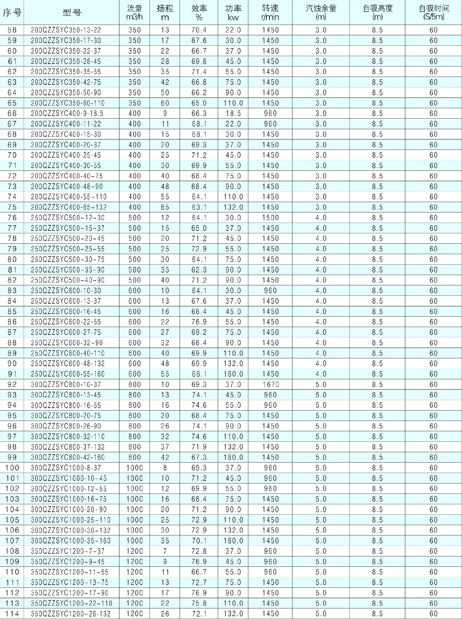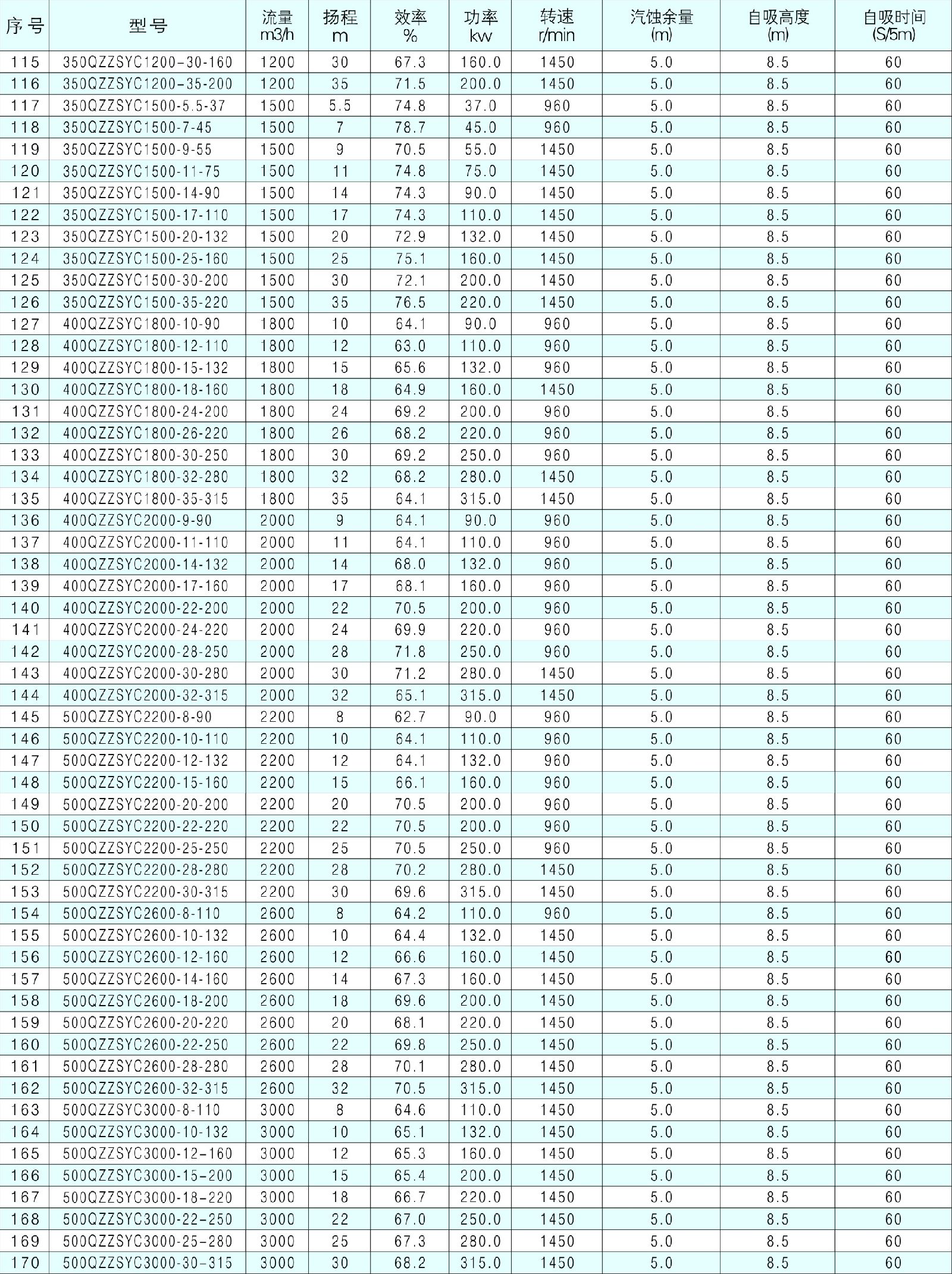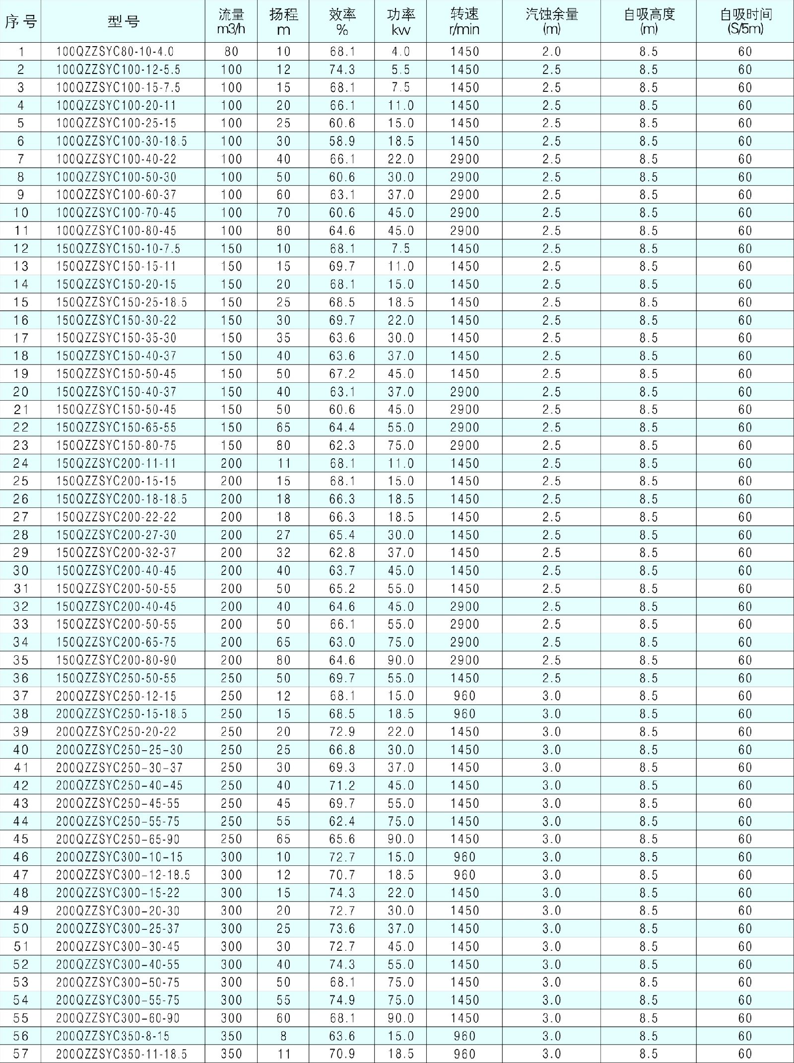 3、QZZSYCW污水型使用介质重度不超过1240kg/m3,污水型同型号泵扬程低于清水型10%